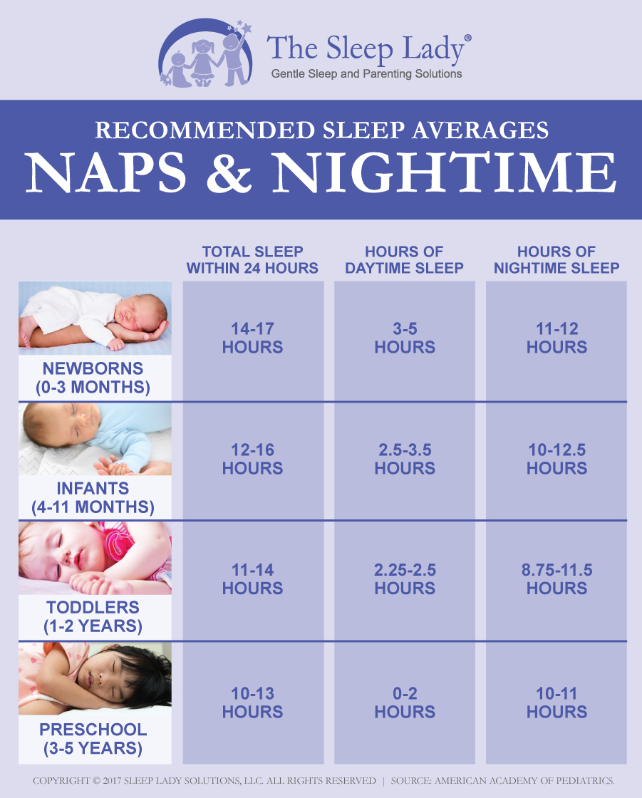 The Sleep Lady has found over her 20 years of practicing as a sleep coach that most children under 3 years of age lean towards the higher end of these averages of night sleep. For instance a 1-2 year old on average tends to need 11 hours of sleep at night vs 8.75 hours.