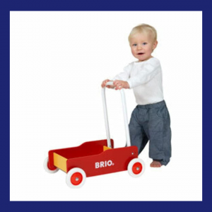 If you haven’t already, consider a push toy like this one that can help to encourage your toddler to walk and move as much as possible. We like the Brio Toddler Wobbler. Not only will it help them walk about to get energy out, but they’ll also love stacking toys in the basket of the walker.